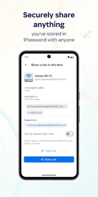 Share passwords and anything you store in 1Password with anyone, even if they don’t use 1Password. Securely (and temporarily) share Wi-Fi details, financial information, and other sensitive info with friends, family, or colleagues to keep that information out of insecure channels like email and messaging apps.