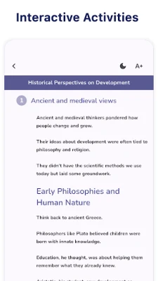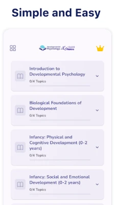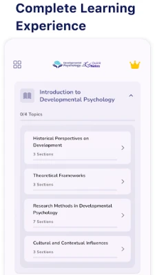 • Structured Content: Learn Developmental Psychology step-by-step, covering childhood, adolescence, adulthood, and aging.